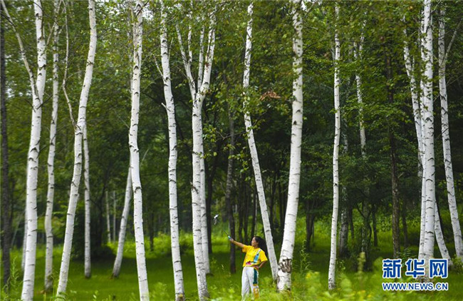 8月8日,游客在伊春市九峰山養(yǎng)心谷景區(qū)白樺林里自拍。