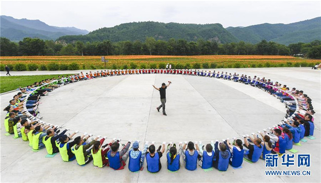 8月8日,游客在伊春市九峰山養(yǎng)心谷景區(qū)進(jìn)行集體游戲活動(dòng)。