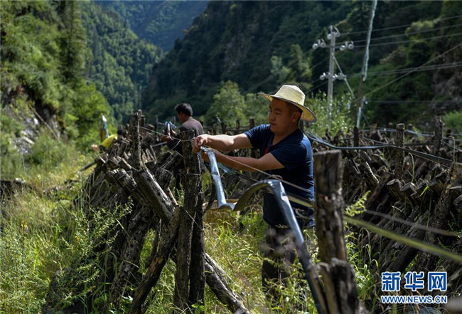 8月10日,四川壤塘縣下大石溝村黨支部書(shū)記索更(右一)帶領(lǐng)村民為村集體的青杠木耳種植示范基地更換噴淋水管。新華社記者 張超群 攝.