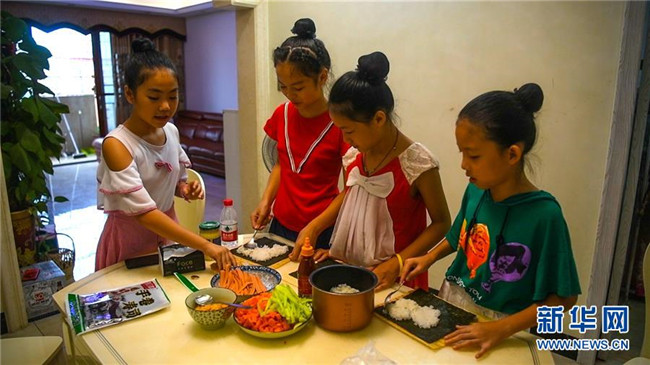 8月6日,芭蕾小天使們在同伴家中學(xué)做壽司(視頻截圖)。新華社記者 張愛林 攝