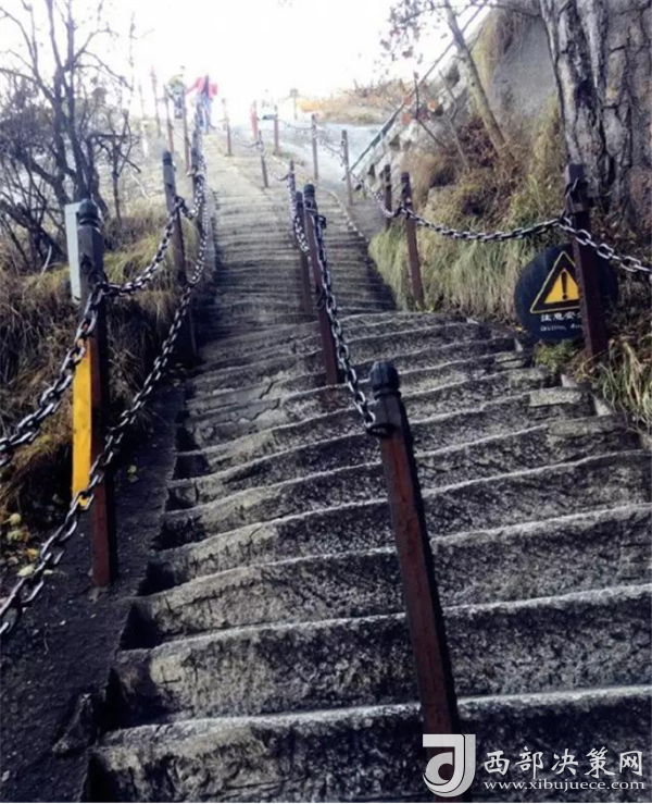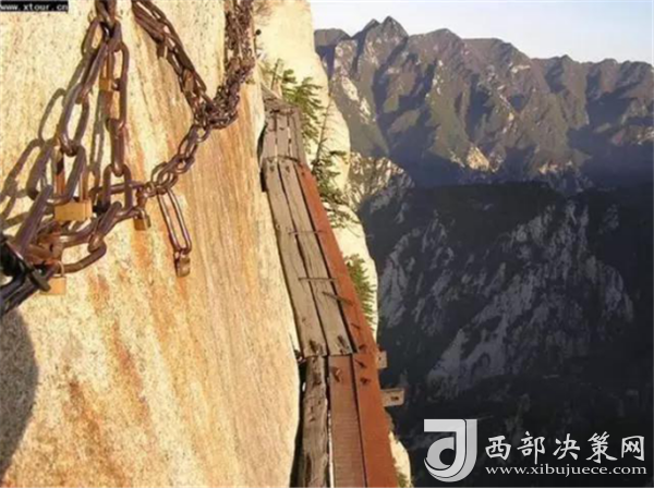 在從南峰到東峰的山路上還有兩處景點(diǎn):一是"避詔崖",著名道士陳摶,為躲避皇帝征召曾避居此處的山洞中;另一處是絕壁千丈而不見底的長(zhǎng)空棧道,棧道依懸崖開鑿,游人需手扶鐵索木欄而過,是華山上又一險(xiǎn)處。