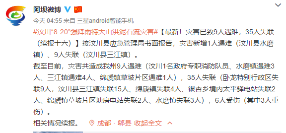 截至目前,災害共造成我州9人遇難(汶川1名政府專職消防隊員、水磨鎮(zhèn)遇難3人、三江鎮(zhèn)遇難4人、綿虒鎮(zhèn)草坡片區(qū)遇難1人),35人失聯(lián)(臥龍?zhí)貏e行政區(qū)失聯(lián)9人,汶川縣三江鎮(zhèn)失聯(lián)15人、綿虒鎮(zhèn)失聯(lián)4人、銀杏鄉(xiāng)境內(nèi)太平驛電站失聯(lián)2人、綿虒鎮(zhèn)草坡片區(qū)塘房電站失聯(lián)2人、水磨鎮(zhèn)失聯(lián)3人),6人受傷(其中3人重傷)。