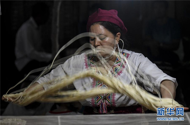 在新疆喀什市歐爾達(dá)路的夜市上,一名廚師在攤位前制作拉面(8月12日攝)。新華社記者 王菲 攝