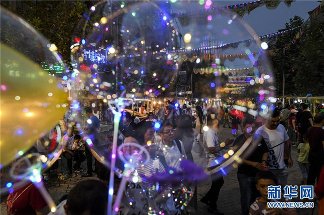 在新疆喀什市歐爾達(dá)路的夜市上,人們在觀光購物(8月18日攝)。新華社記者 王菲 攝