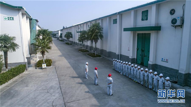 8月26日,中儲糧襄陽直屬庫職工在召開班前會(無人機(jī)拍攝)。