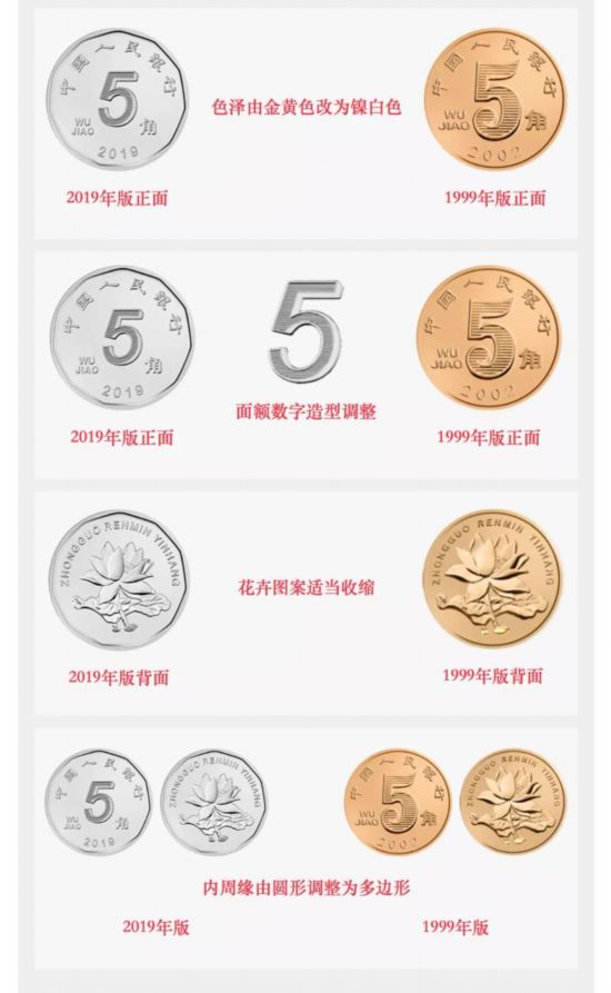 值得一提的是,5角硬幣材質(zhì)由鋼芯鍍銅合金改為鋼芯鍍鎳,色澤由金黃色改為鎳白色。正背面內(nèi)周緣由圓形調(diào)整為多邊形。直徑保持不變。