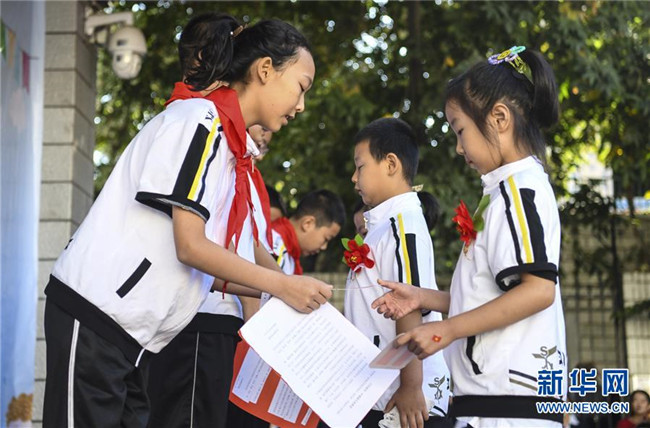9月4日,新疆教育學(xué)院實(shí)驗(yàn)小學(xué)校園內(nèi),一年級新生在六年級學(xué)生的指導(dǎo)下學(xué)習(xí)握拳宣讀誓言。