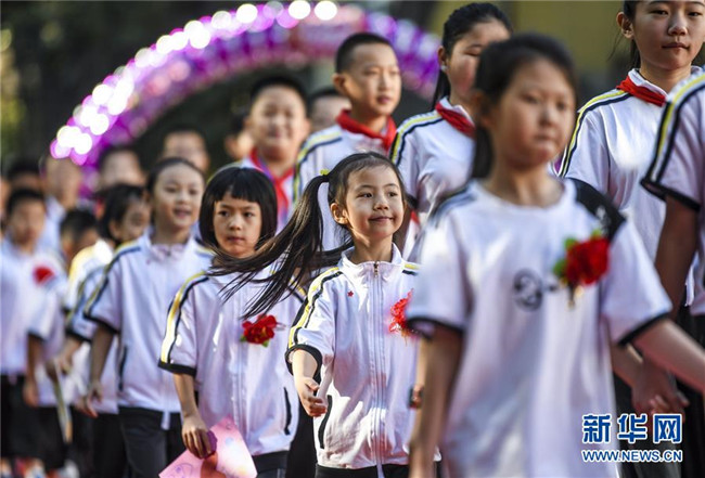 新學(xué)年伊始,新疆教育學(xué)院實(shí)驗(yàn)小學(xué)舉辦主題為“夢想從這里啟航”的開學(xué)典禮,一年級新生在六年級學(xué)生的引領(lǐng)下培養(yǎng)愛學(xué)校、愛師長、愛學(xué)習(xí)的品德,走進(jìn)校園開啟新生活。 新華社記者 王菲 攝