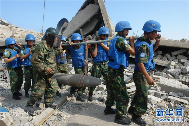 這張未注明拍攝日期的資料照片顯示的是中國維和部隊官兵在黎巴嫩南部轉(zhuǎn)移未爆航彈。 新華社發(fā)
