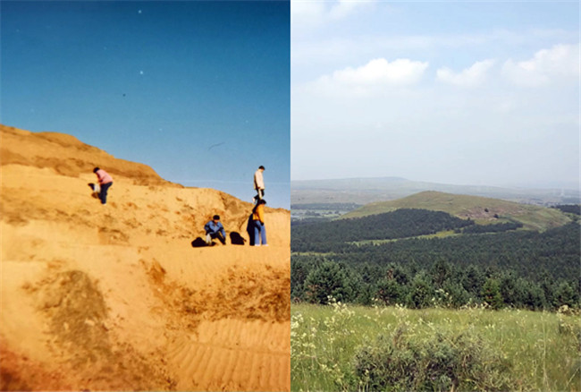 上世紀80年代的白二爺沙壩“除了黃沙就是黃沙”。如今,這里造林種草保存面積達12萬畝,植被蓋度提高到75%以上。 左圖:白二爺沙壩治沙站辦公室供圖 右圖:人民網(wǎng)記者 王欲然攝