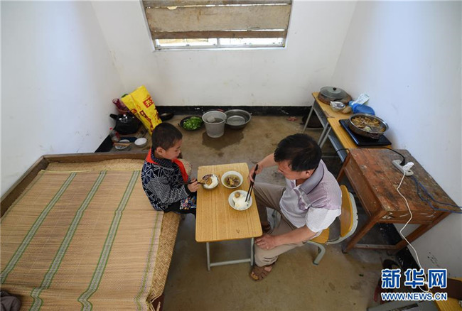 在廣西都安瑤族自治縣菁盛鄉(xiāng)義德小學弄豆教學點,藍啟飛老師和學生藍孟源一起吃午餐(2015年4月15日攝)。當時,藍啟飛是這所學校唯一的老師,藍孟源是這所學校唯一的學生。新華社記者 陸波岸 攝