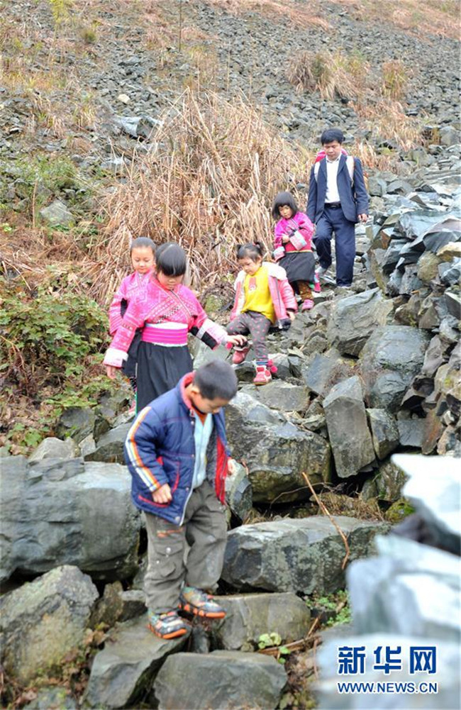 在廣西龍勝各族自治縣龍脊鎮(zhèn)江柳村,翁江教學點老師余啟貴和學生一起走在去學校的路上(2013年2月26日攝)。新華社記者 陸波岸 攝