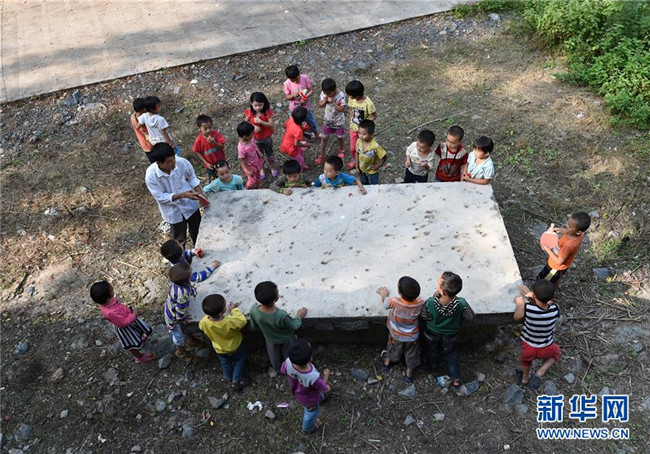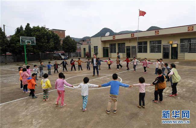 在廣西富川瑤族自治縣湖廣小學,學校師生課間一起做游戲(3月20日攝)。湖廣小學是一所位于湘桂邊界的學校,學生一部分來自湖南,一部分來自廣西。兩名老師,一名來自湖南,一名來自廣西。新華社記者 陸波岸 攝