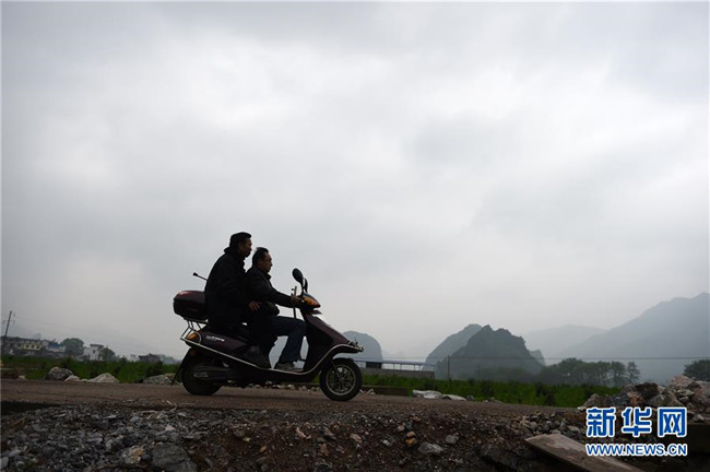 在廣西灌陽縣洞井瑤族鄉(xiāng),桂平巖小學老師趙仁斌(前)用電單車將楊大杰老師載去學校的路上(2016年3月24日攝)。2015年3月,楊大杰被診斷為股骨頭壞死,經(jīng)過一段時間治療病情有所緩解后,他堅持帶病回到教學崗位上。新華社記者 陸波岸 攝