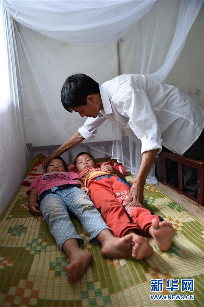 在廣西東蘭縣三石鎮(zhèn)泗爺小學,黃英雄老師在照顧學生睡午覺(2014年9月10日攝)。新華社記者 陸波岸 攝