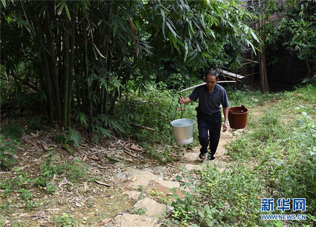 在廣西天等縣進結(jié)鎮(zhèn)愛樂村龍坡屯,龍坡教學點老師黃明料在教學點附近農(nóng)家挑水回學校給學生做午飯(2015年9月10日攝)。新華社記者 陸波岸 攝