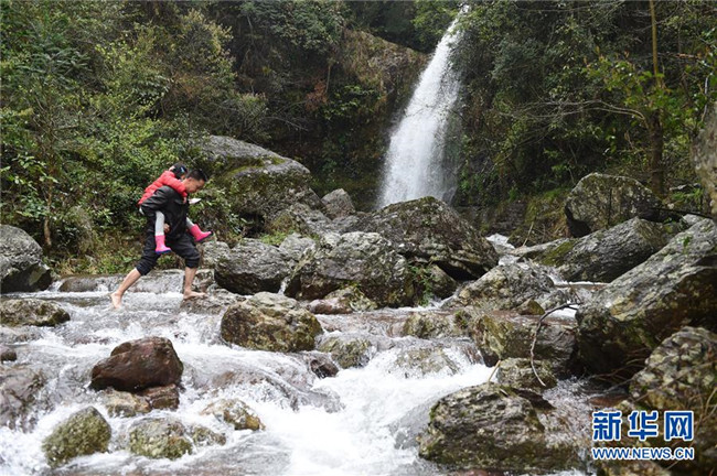 在廣西灌陽縣洞井瑤族鄉(xiāng)野豬殿村,野豬殿村小學老師周運雄放午學后背著一名學生走過被流水淹沒的路段回家(2016年3月22日攝)。新華社記者 陸波岸 攝