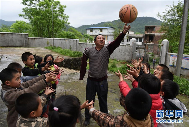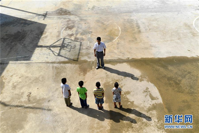 在廣西全州縣白寶鄉(xiāng)北山村小學,唐廣芳老師在給學生上體育課(2016年4月26日攝)。新華社記者 陸波岸 攝