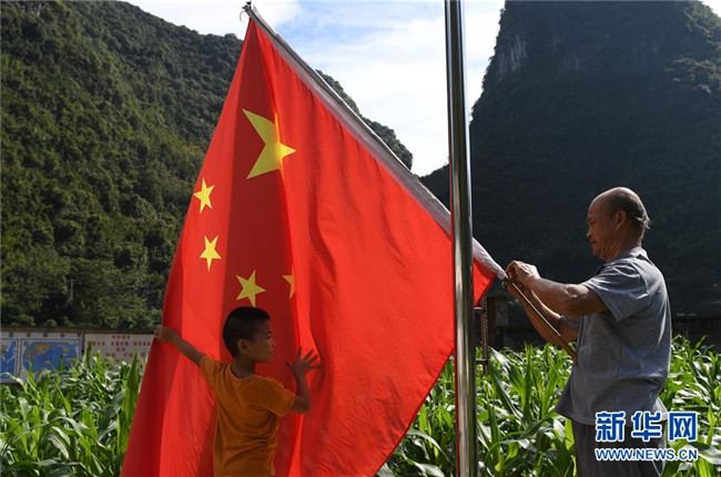 在廣西都安瑤族自治縣龍灣鄉(xiāng)琴棋小學,黃若珍老師(右)和學生準備升國旗(2017年8月31日攝)。新華社記者 陸波岸 攝