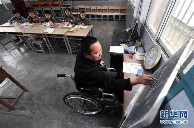 在廣西凌云縣下甲鎮(zhèn)河洲村念恩小學,阮文憑老師坐在輪椅上給學生上課(3月26日攝)。新華社記者 陸波岸 攝