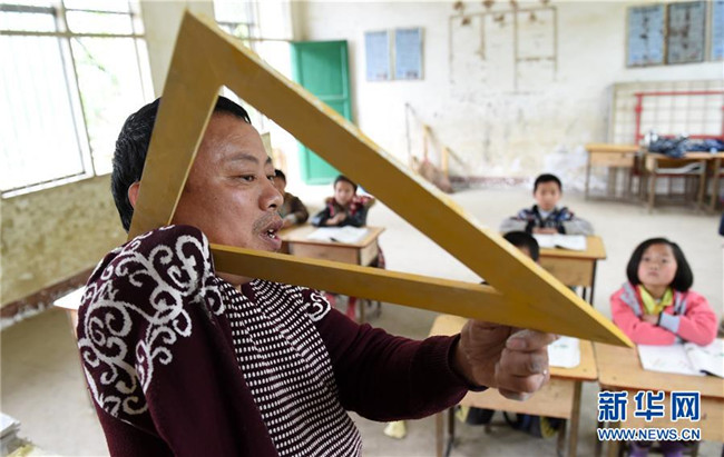 在廣西全州縣白寶鄉(xiāng)北山村小學,唐廣芳老師用殘疾的右臂夾著三角板在給學生上課(2016年4月26日攝)。新華社記者 陸波岸 攝
