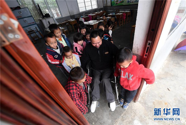在廣西凌云縣下甲鎮(zhèn)河洲村念恩小學,阮文憑老師下課后在學生幫助下坐著輪椅出教室(3月26日攝)。新華社記者 陸波岸 攝
