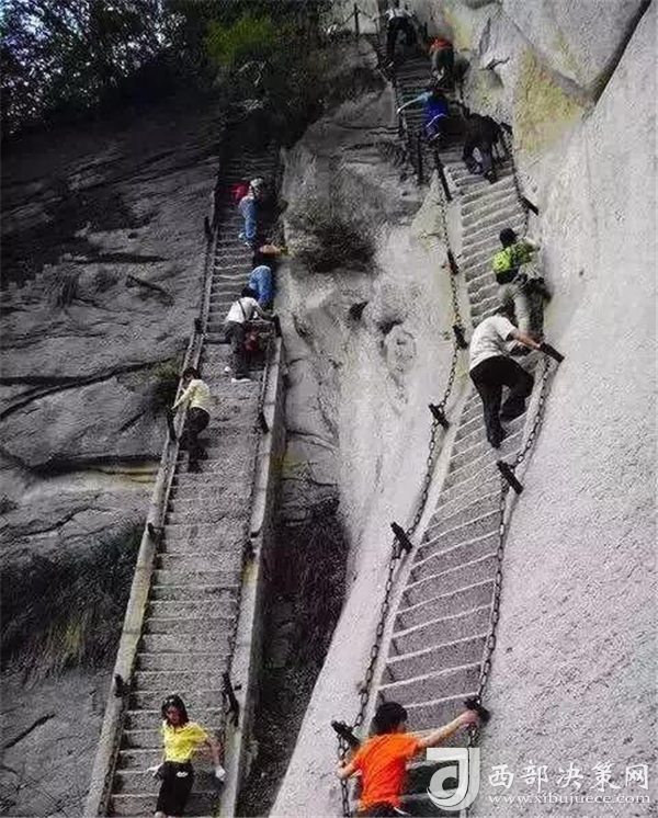 眾所周知,華山在五岳之中以“險(xiǎn)峻”著稱。素有“奇險(xiǎn)天下第一山”之譽(yù),華山的主體是由一塊完整碩大的花崗巖體構(gòu)成的,挺拔地屹立在渭河平原。東、南、西三峰拔地而起,如利刃削就。由于華山太險(xiǎn),所以唐代以前很少有人登臨,歷代君王祭祀西岳,也只是在山下西岳廟中舉行大典。據(jù)記載,直到魏晉南北朝時(shí)期,還沒(méi)有通向華山峰頂?shù)牡缆?。唐代才逐漸在北坡沿溪谷而上開(kāi)鑿了一條險(xiǎn)道,也從此有了“自古華山一條路”的說(shuō)法。
