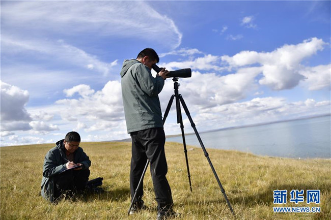 9月23日,青海湖國家級自然保護(hù)區(qū)管理局的巡湖觀測人員在青海湖畔進(jìn)行觀測。