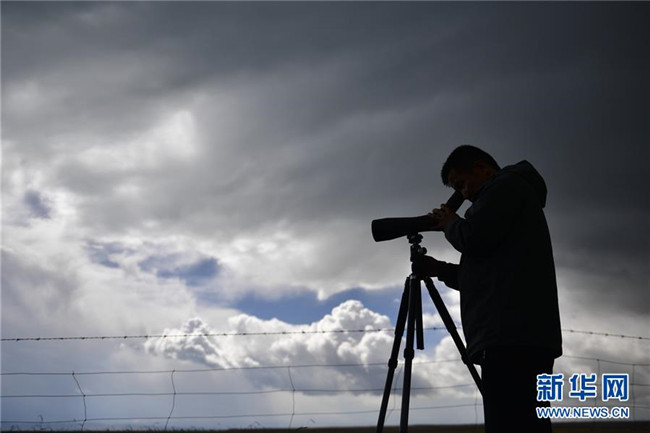 9月23日,青海湖國家級自然保護(hù)區(qū)管理局的巡湖觀測人員楊濤在青海湖畔的尕日拉村觀測點(diǎn)進(jìn)行觀測。