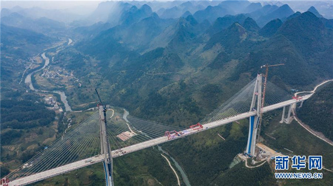 當(dāng)日,332米高的全球最高混凝土橋塔——貴州平塘至羅甸高速公路控制性工程平塘特大橋成功合龍。記者從貴州省交通運(yùn)輸廳了解到,平塘特大橋全長2135米,橋面寬30.2米,規(guī)劃雙向4車道,是一座三塔雙索面疊合梁斜拉橋。三座橋塔的高度分別為320米、332米和298米,相當(dāng)于在峽谷之中建了三座100多層高的大樓。平塘特大橋于2016年4月開工建設(shè),2018年11月橋塔順利封頂,計(jì)劃總工期為42個月,總投資15億元。此次合龍后,還要進(jìn)行橋面施工和欄桿等工程建設(shè),預(yù)計(jì)今年底全橋通車,屆時平塘到羅甸的通行時間將從2個半小時縮短至1小時,將成為連接貴州南部的交通要道,對助推滇黔桂石漠化片區(qū)脫貧攻堅(jiān)具有重要意義。新華社記者楊文斌攝