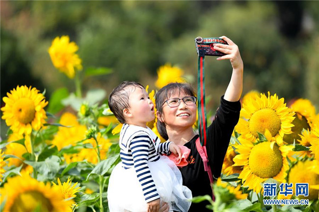 10月10日,家長(zhǎng)和孩子在湖南省森林植物園的向日葵花海中自拍。新華社記者 陳澤國(guó) 攝