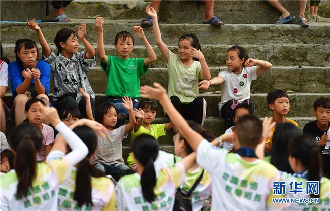 黔桂烏英苗寨的孩子們在澳門志愿者的指導下練習表演(8月10日攝)。