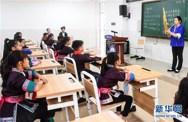 這是廣西三江侗族自治縣民間藝人在教江川小學(xué)學(xué)生吹奏蘆笙(10月14日攝)。新華社記者張愛(ài)林?jǐn)z