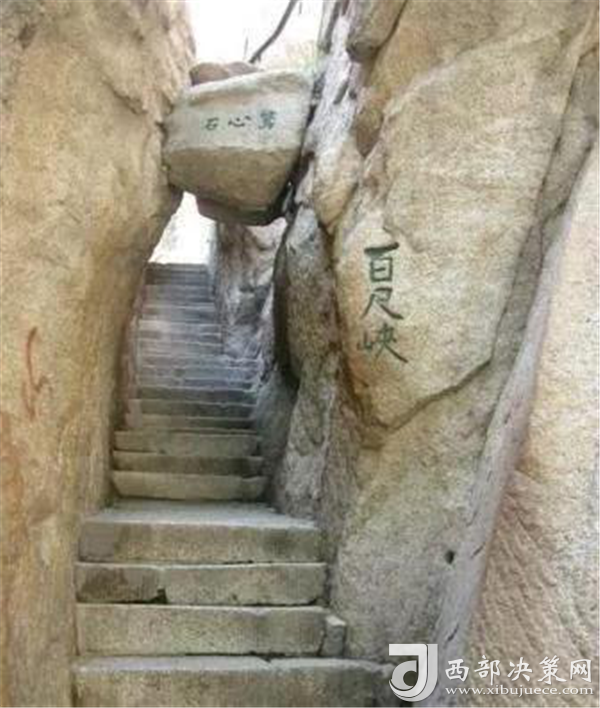 出千尺幢不遠(yuǎn)是百尺峽,這里是登山第二道險(xiǎn)關(guān)。雖沒有千尺幢那么長(zhǎng),僅46米,石階91級(jí),但仍是華山天險(xiǎn)之一。這里勢(shì)危坡陡,石壁峭立,通道狹窄,且有懸石,搖搖欲墜。游人至此都心驚膽顫。明顧端木有詩(shī)狀其險(xiǎn)曰:"幢去峽復(fù)來,天險(xiǎn)不可瞬。雖云百尺峽,一尺一千仞。"千尺幢、百尺峽的臺(tái)階都是從明末清初開始鑿的,民國(guó)時(shí)幾經(jīng)加固,解放后又多次修整,一九八五年又鑿復(fù)道,游人上下各行其道。