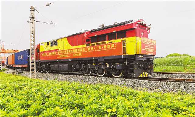 滿(mǎn)載125臺(tái)整車(chē)的專(zhuān)列從重慶沙坪壩區(qū)團(tuán)結(jié)村中心站駛出,標(biāo)志著西部陸海新通道整車(chē)出口常態(tài)化班列的開(kāi)啟。(本報(bào)資料圖片) 記者 羅斌 攝