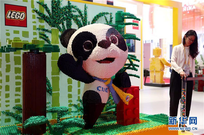 11月3日,在品質(zhì)生活展區(qū)的樂高展臺,用積木搭成的進(jìn)博會吉祥物熊貓“進(jìn)寶”已安裝就緒。新華社記者劉穎攝
