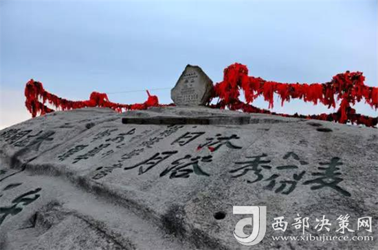 西峰為一塊完整巨石,渾然天成。西北絕崖千丈,似刀削鋸截,其陡峭巍峨、陽剛挺拔之勢是華山山形之代表,因此古人常把華山叫蓮花山。華山西峰就是《寶蓮燈》中沉香劈山救出三圣母的地方。現(xiàn)在翠云宮邊上有一巨石中間裂開,如被斧劈,名“斧劈石”,旁邊還樹立一柄長把大斧。峰的西北面,直立如刀削,空絕萬丈,人稱舍身崖。峰上崖壁題刻遍布,工草隸篆,琳瑯滿目。峰北絕頂叫西石樓峰,峰上楊公塔為楊虎城將軍所建,塔上有楊虎城將軍親筆題辭。塔下巖石上有“枕破鴻蒙”題刻,是書法家王鐸手跡。