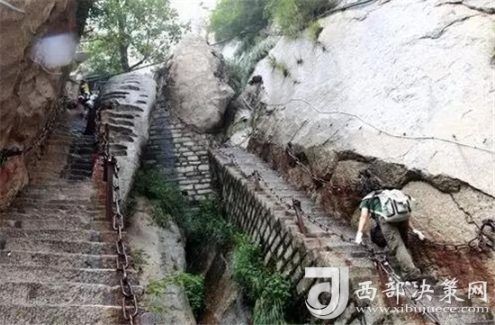 從群仙觀上行,便是“老君犁溝”。傳說,這里原來沒有路,是老子李耳駕青牛用鐵犁開的,形如耕地時留下的犁溝,故被稱為“老君犁溝”。“老君犁溝”同千尺幢、百尺峽一樣,是登華山的必經(jīng)險道之一?,F(xiàn)在,已在犁溝的右上方,鑿成271個石級,兩旁鐵鏈下垂,行走較為安全。