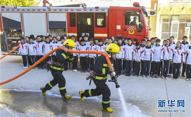 11月8日,消防員在河北省大廠回族自治縣城關(guān)小學(xué)向?qū)W生們展示消防設(shè)備的使用方法。新華社記者李曉果攝