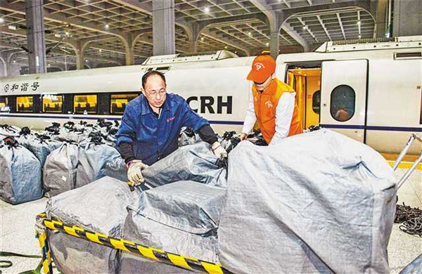 11月12日晚,重慶西站,工作人員正在卸載G8595次列車上的快件。為應對“雙11”帶來的巨量物流,重慶鐵路部門利用高鐵動車組、旅客列車行李車等運力資源,提供物流服務。記者龍帆攝