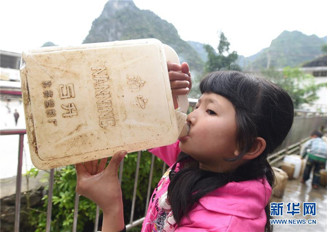 在廣西大化瑤族自治縣板升鄉(xiāng)八好小學(xué),一名學(xué)生喝水桶里的雨水(2014年11月24日攝)。八好小學(xué)有400多名學(xué)生,曾僅有一個不足100立方米的水柜,用于收集儲存樓頂?shù)挠晁瑢W(xué)生需定期定量用水。遇到長時間不下雨,學(xué)校需要到鄉(xiāng)政府所在地運(yùn)水。如今,學(xué)校修建了5個大水柜,并從兩公里外引泉水到校園,飲水難問題得到解決。 新華社記者 黃孝邦 攝