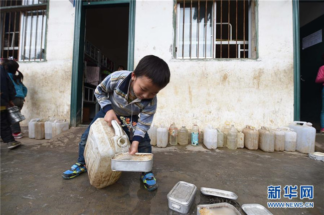 在廣西大化瑤族自治縣板升鄉(xiāng)八好小學(xué),一名學(xué)生用儲備在水桶里的雨水淘米煮飯(2014年11月24日攝)。八好小學(xué)有400多名學(xué)生,曾僅有一個不足100立方米的水柜,用于收集儲存樓頂?shù)挠晁瑢W(xué)生需定期定量用水。遇到長時間不下雨,學(xué)校需要到鄉(xiāng)政府所在地運(yùn)水。如今,學(xué)校修建了5個大水柜,并從兩公里外引泉水到校園,“飲水難”問題得到解決。 新華社記者 黃孝邦 攝
