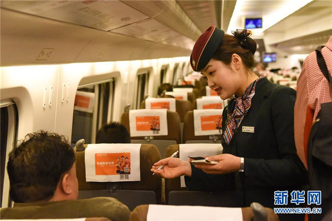 11月16日,在由烏魯木齊開往哈密的D8804次動車組列車上,列車乘務員為旅客檢票。新華社記者 丁磊 攝