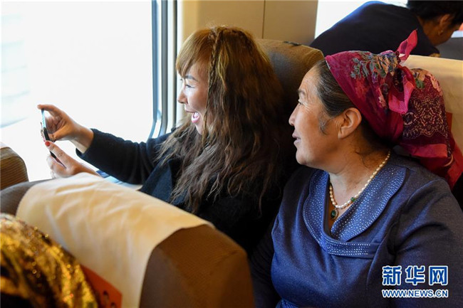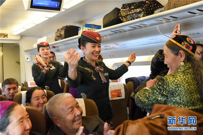11月16日,在D8804次動車組列車上,乘務員和乘客跳起舞慶祝蘭新高鐵新疆段開通運營五周年。新華社記者 丁磊 攝