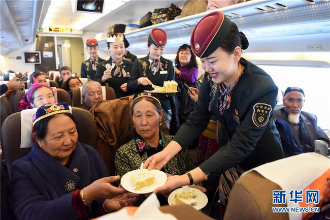 11月16日,在D8804次動車組列車上,乘務員為乘客送上蘭新高鐵新疆段開通運營五周年的“生日”蛋糕。新華社記者 丁磊 攝