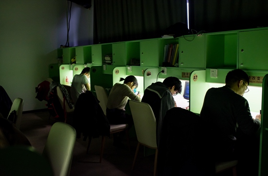 11月22日,北京中關(guān)村一家付費(fèi)自習(xí)室內(nèi),顧客在“暗室”中學(xué)習(xí)。正值考研季,付費(fèi)自習(xí)室里的多數(shù)顧客都是為考研而來(lái)。