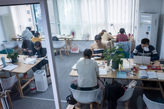 11月22日,袁翊宸在北京中關(guān)村的一家付費(fèi)自習(xí)室中學(xué)習(xí)。從5月開(kāi)始,他每天乘坐40分鐘的公交車來(lái)到這家自習(xí)室,備考北大金融專業(yè)的研究生。