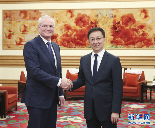 12月3日,中共中央政治局常委、國(guó)務(wù)院副總理韓正在北京中南海會(huì)見(jiàn)美國(guó)??松梨诠径麻L(zhǎng)兼首席執(zhí)行官伍德倫。 新華社記者 丁海濤 攝