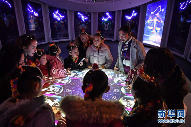 12月14日,拉薩市實(shí)驗(yàn)小學(xué)學(xué)生在藏域星球天文科普體驗(yàn)館學(xué)習(xí)星座知識。當(dāng)日,藏域星球天文科普體驗(yàn)館在西藏拉薩開館試運(yùn)營,這是西藏第一家天文科普體驗(yàn)館。據(jù)介紹,此館以感知宇宙、認(rèn)知宇宙、探索宇宙為主題,以參觀者的第一感官體驗(yàn)為設(shè)計導(dǎo)向,利用互動投影、懸浮投影、物體跟蹤、人體捕捉、體感互動、VR等高科技手段展示藏地的神秘,揭示宇宙的奧秘。新華社記者李鑫攝