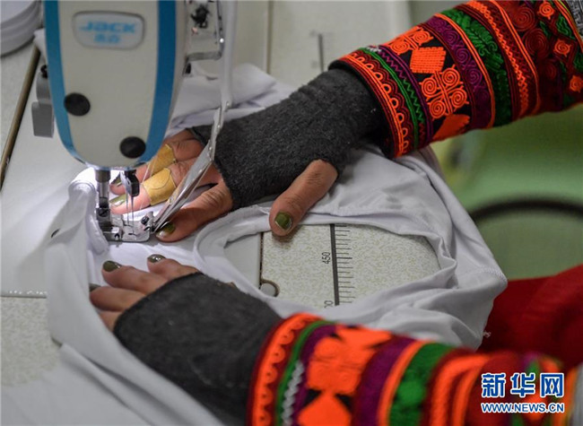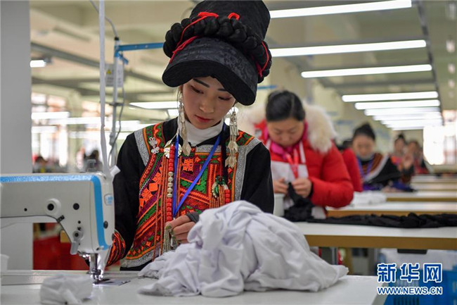 12月19日,一名身著彝族傳統(tǒng)服裝的女工在扶貧制衣車間工作。新華社記者 張超群 攝
